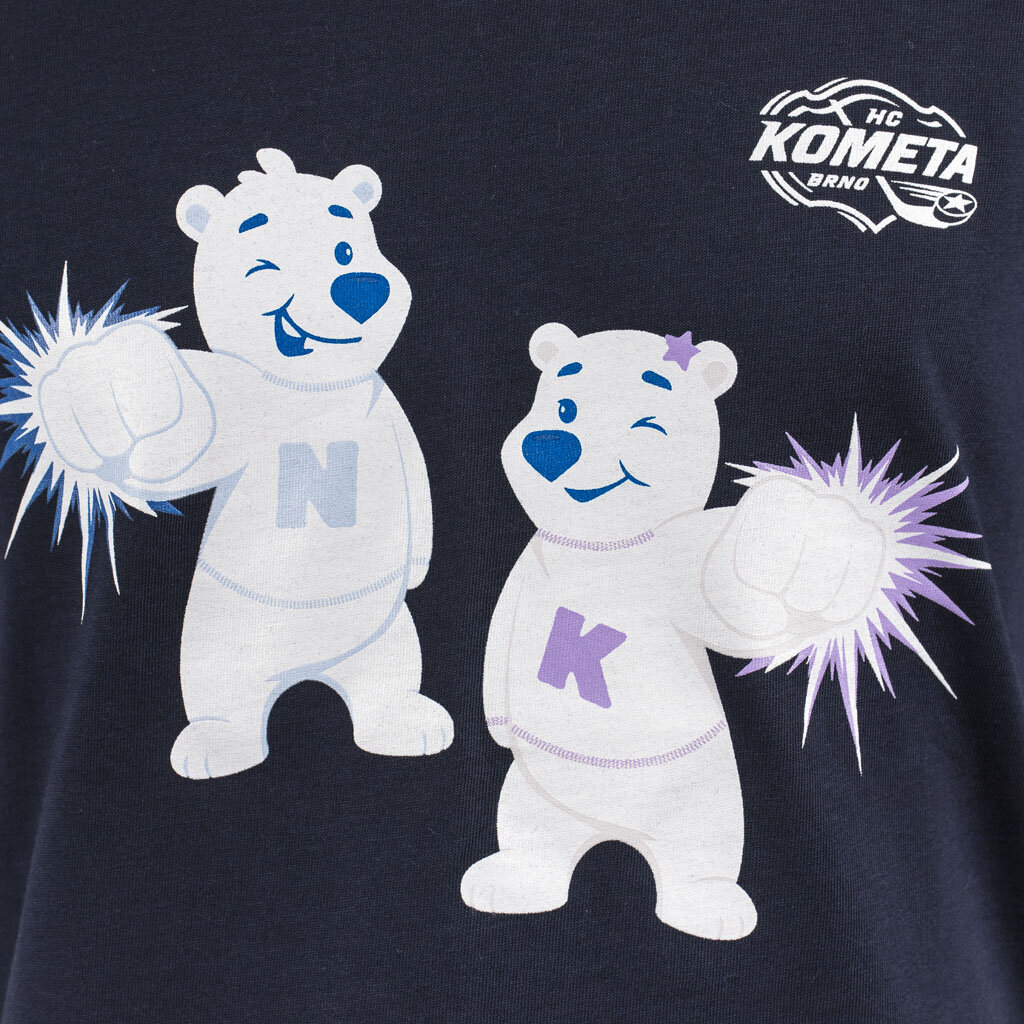 Motiv zobrazuje Nanuka a Kometu s pěstičkou doplněné logem Komety, což vytváří hravý a sportovní vzhled. Skvělá volba na běžné nošení, do školy i na fandění, kde děti mohou ukázat svou podporu oblíbenému týmu.