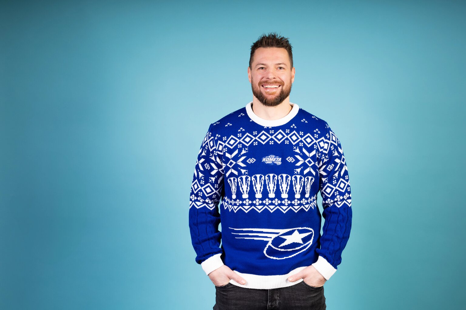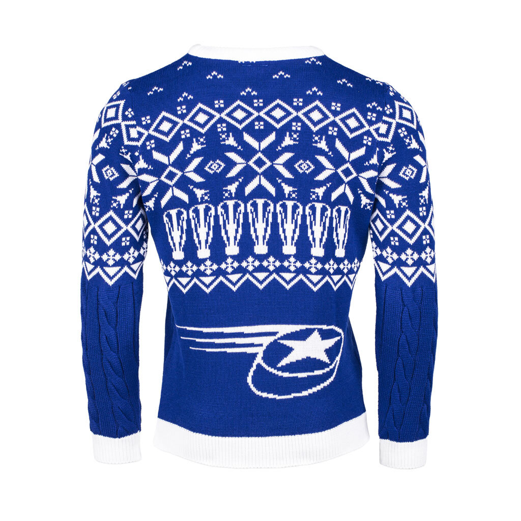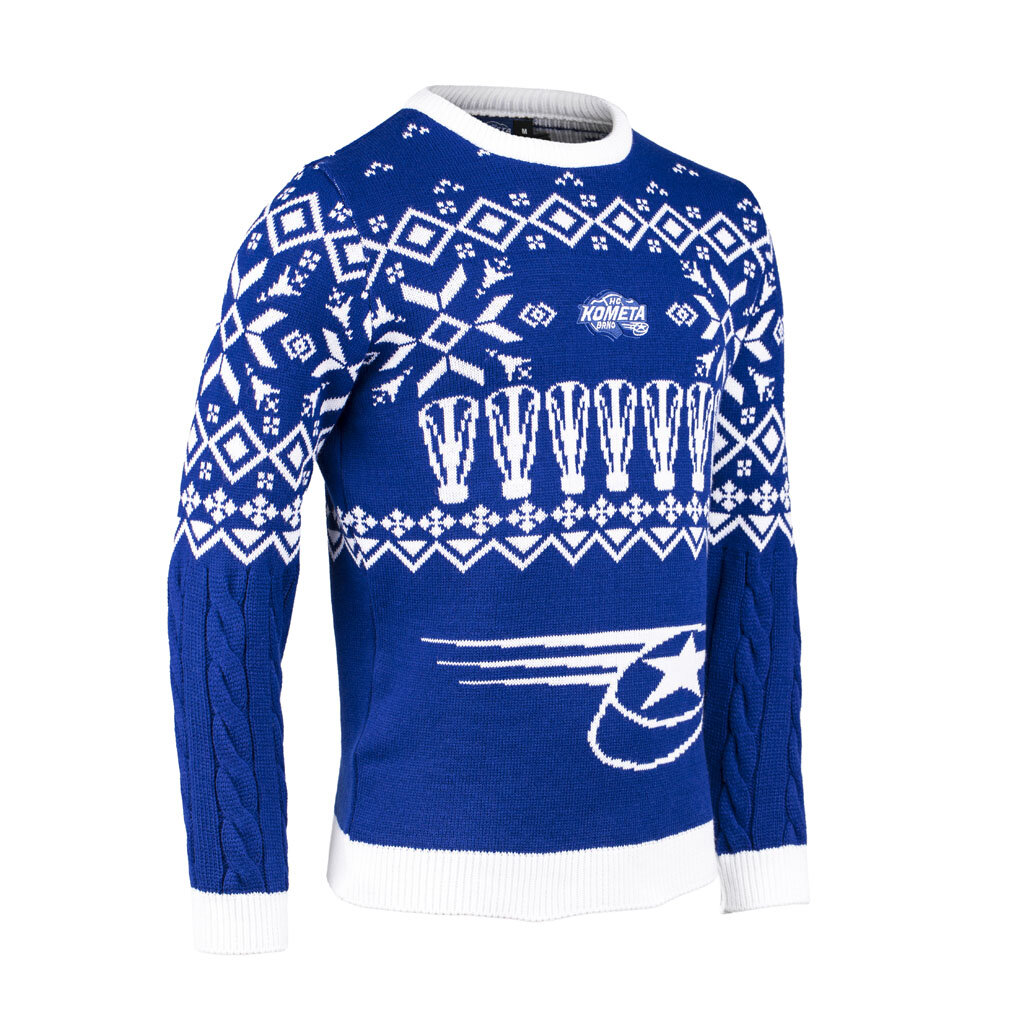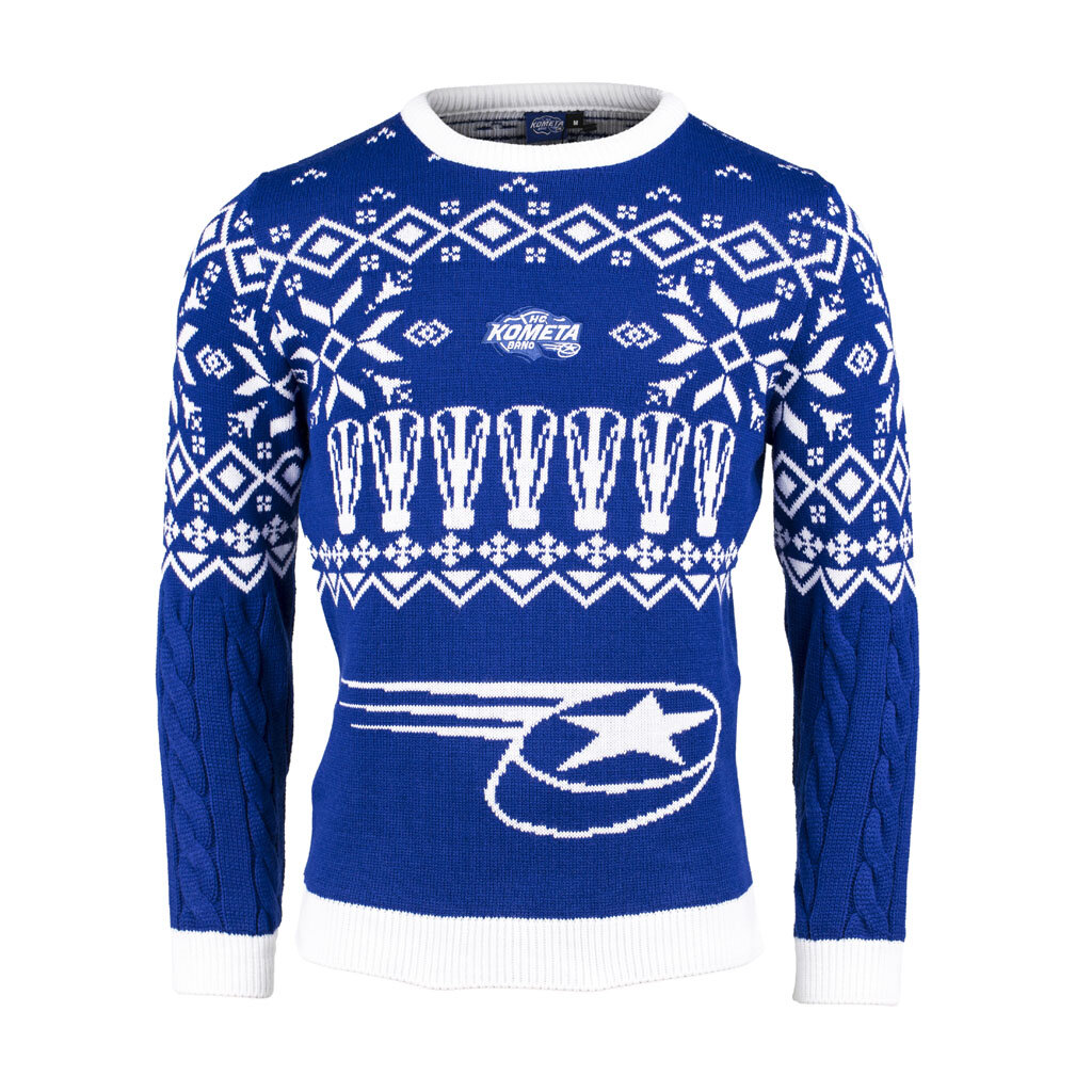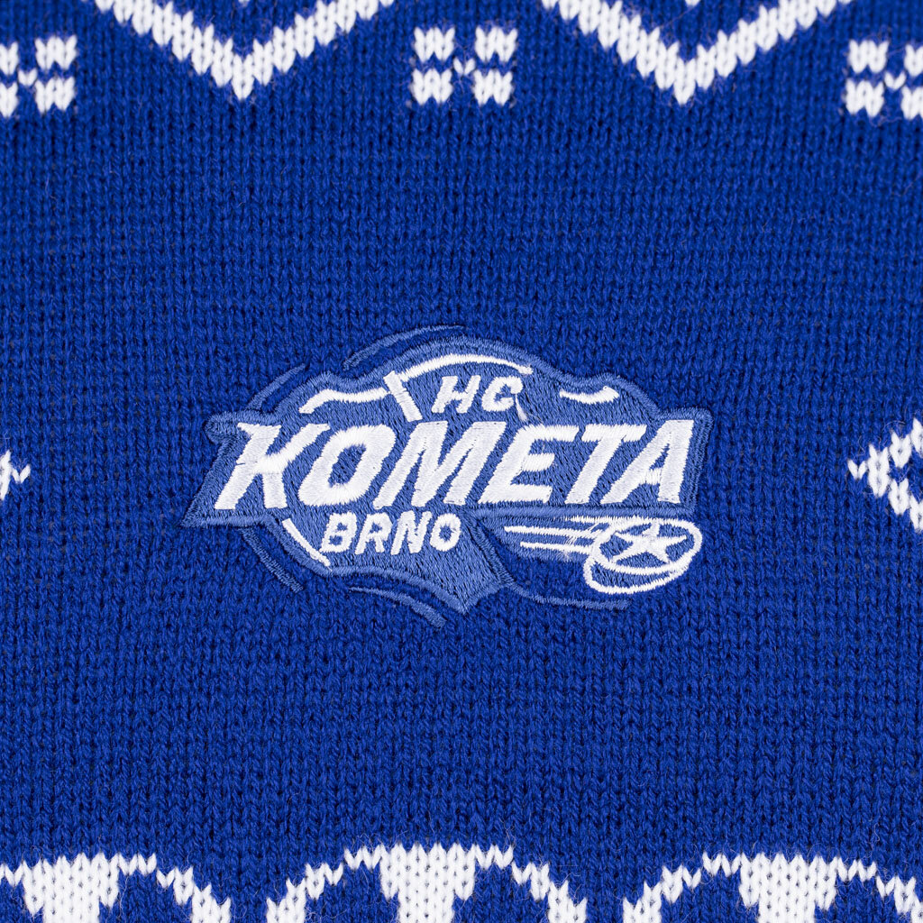 Svetr je vyroben v tradiční modré barvě, kterou doplňují elegantní bílé vzory s vánočními a zimními motivy, které okamžitě navodí sváteční atmosféru. Na hrudi je precizně vyšívané logo Komety, které reprezentuje klubovou hrdost a lásku k hokeji.