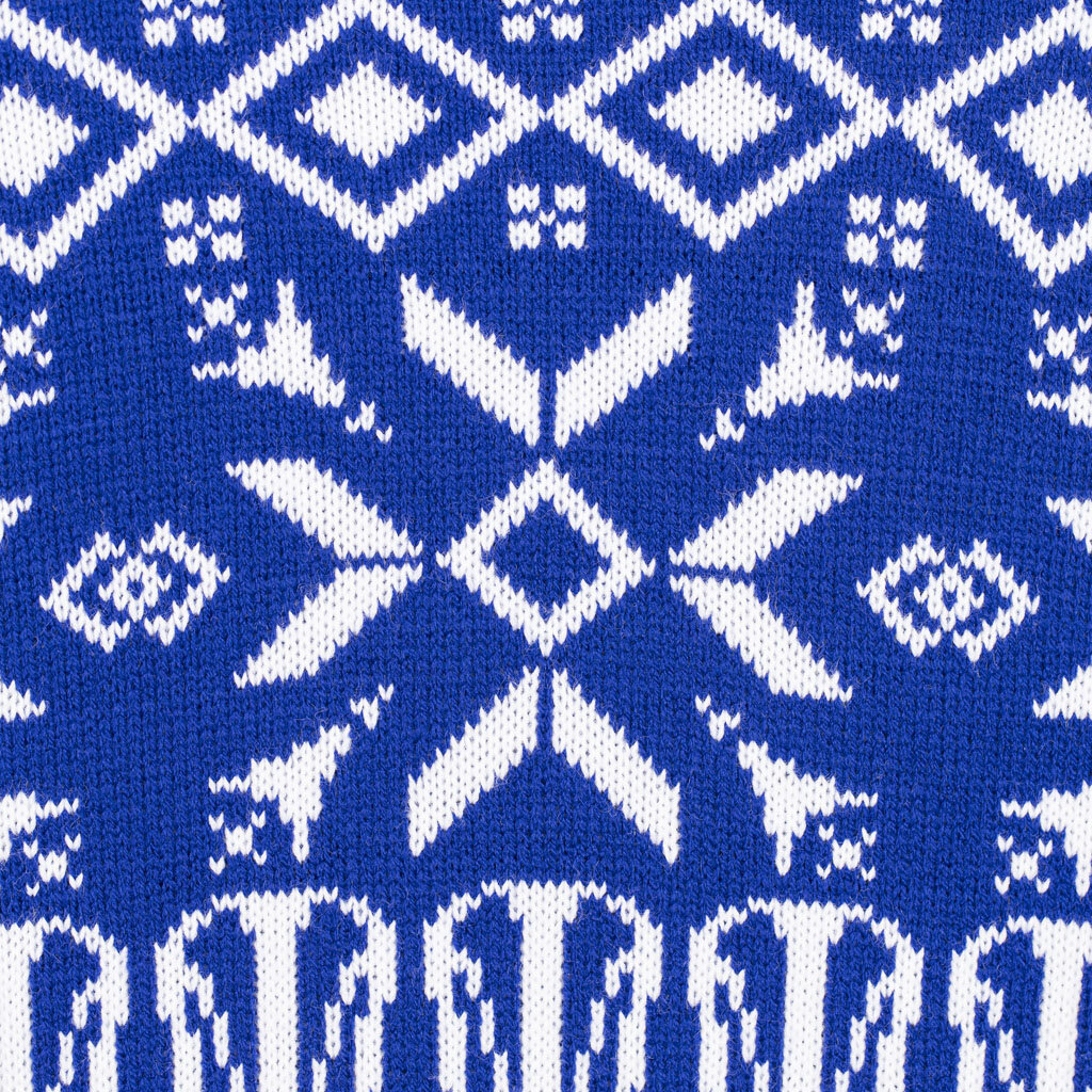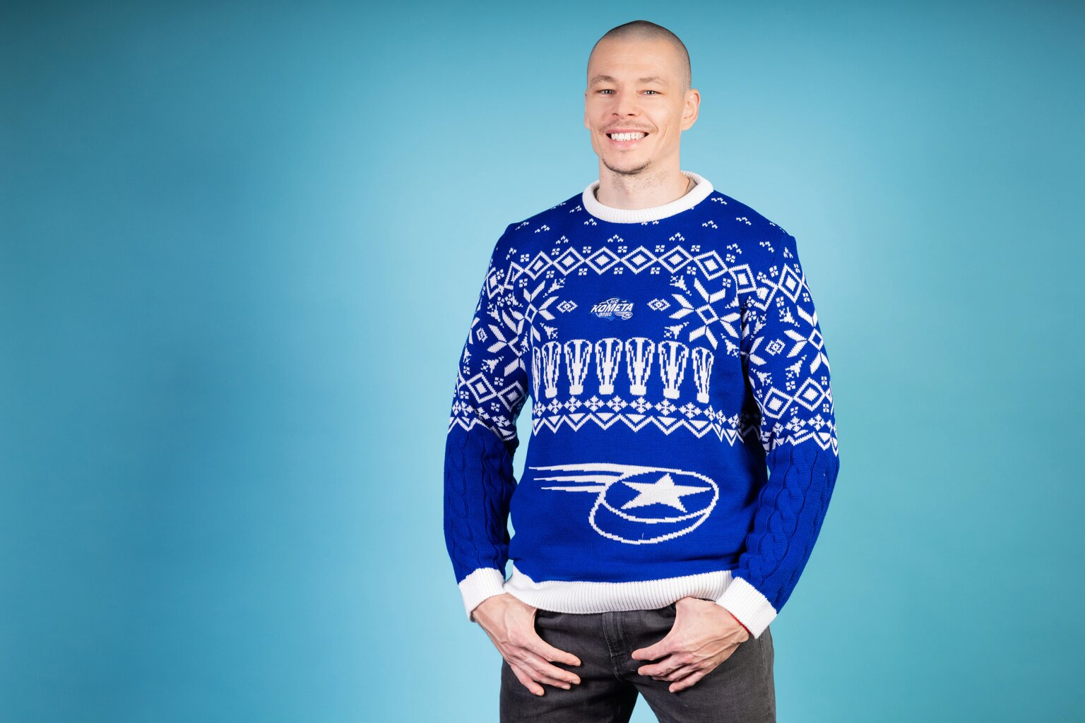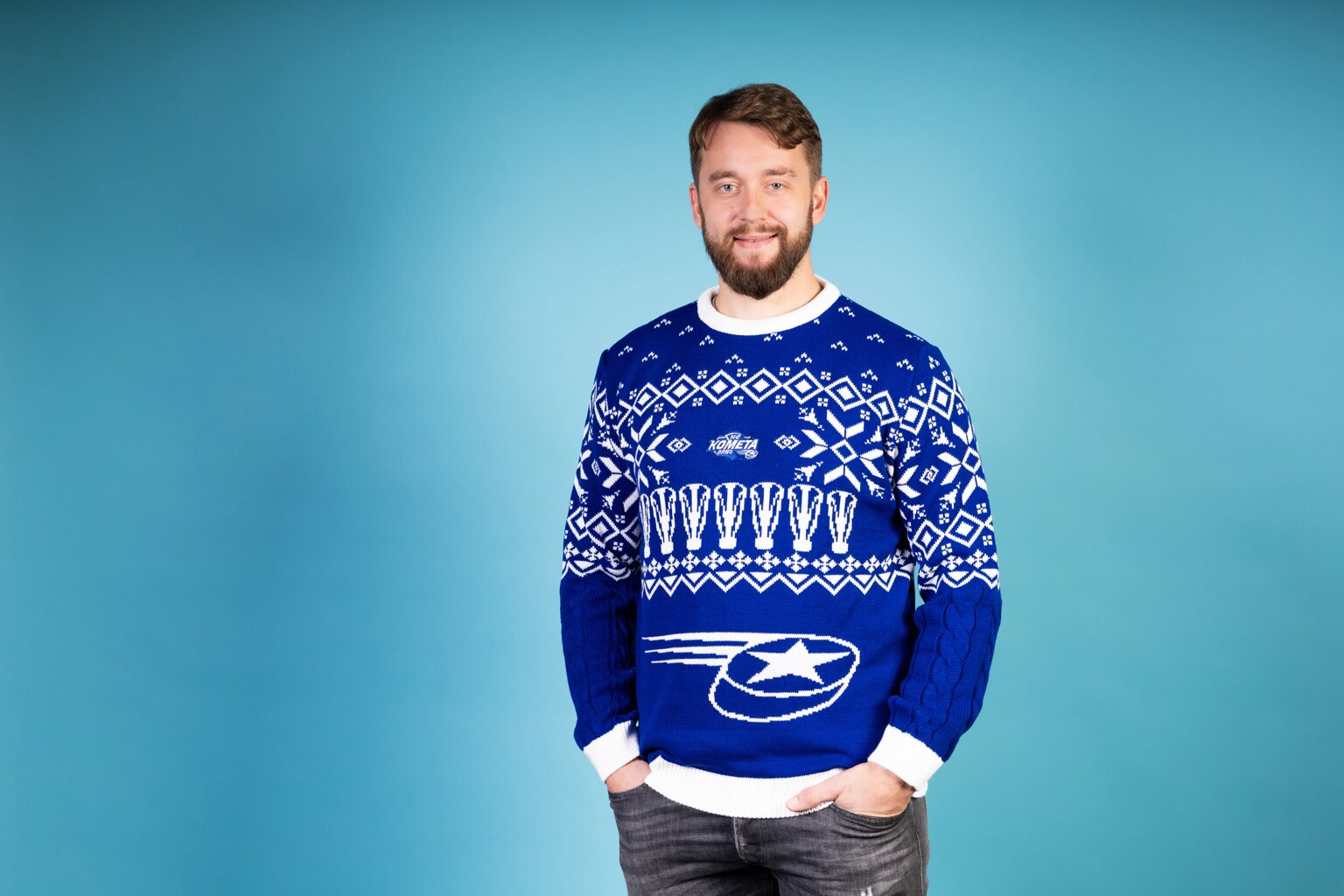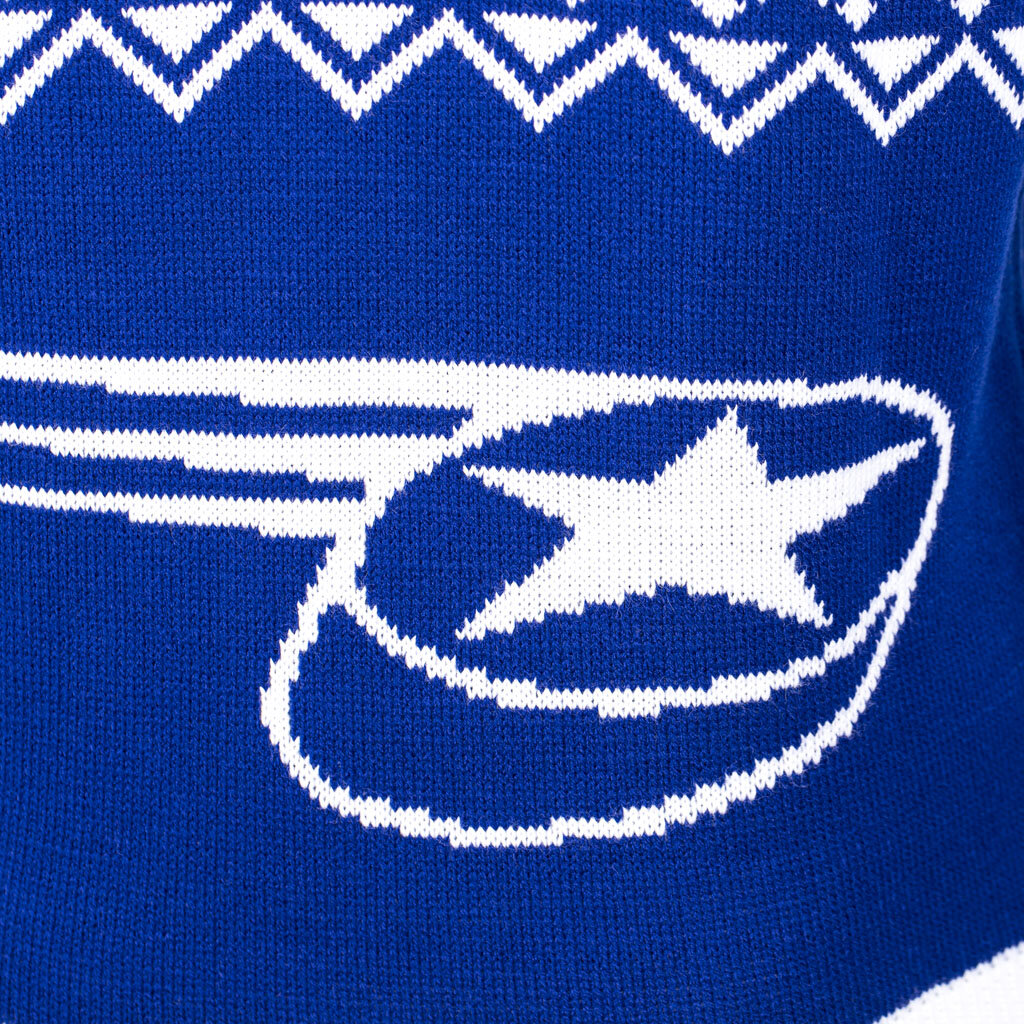 Svetr je vyroben v tradiční modré barvě, kterou doplňují elegantní bílé vzory s vánočními a zimními motivy, které okamžitě navodí sváteční atmosféru. Na hrudi je precizně vyšívané logo Komety, které reprezentuje klubovou hrdost a lásku k hokeji.
